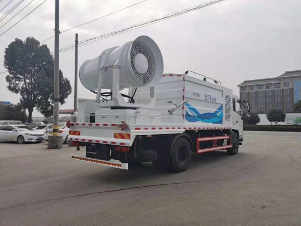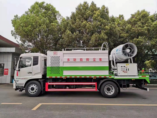 2.抑塵裝置采用國內(nèi)知名品牌,成霧量大、粒徑范圍大。霧炮噴射距離遠(yuǎn),且能實(shí)現(xiàn)俯仰角度可調(diào),滿足不同噴射距離工況的需求。使用副發(fā)動機(jī)驅(qū)動,傳動效率高。操作簡單,各功能通斷控制為電控氣動,一鍵切換,無需手動。