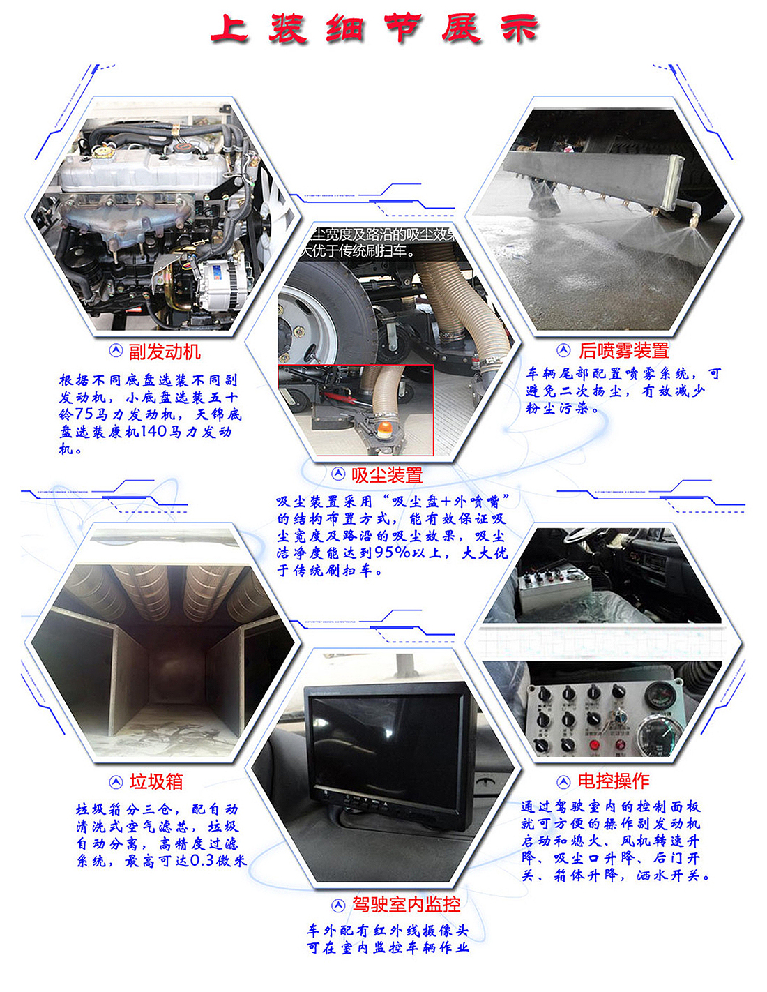東風小多利卡5方吸塵車專用配置:塵箱:4立方米,水箱:1立方米;中置吸盤、江鈴五十鈴副發(fā)動機、施耐德控制開關(guān)、海普瑞斯電磁閥組、無級變速自動離合器、免維護離心式風機、高精度垃圾箱過濾系統(tǒng)(最高可達0.5微米),不銹鋼垃圾箱、進口脈沖閥、垃圾箱舉升自卸、尾部LED箭頭燈、車尾霧狀噴水潤濕功能、倒車影像、手動泵應急系統(tǒng)。
